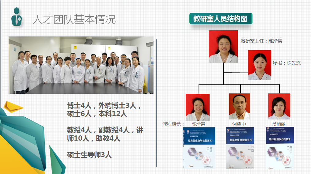 首先在人才队伍建设方面,我们的教师团队共有25人,其中博士4人,外聘博士3人,硕士6人,本科12人;教授4人,副教授4人,讲师10人,助教4人;硕士生导师3人。陈泽慧老师担任教研室主任,陈先恋老师任教学秘书;陈泽慧老师、何应中老师和张丽丽老师分别任三门课程的课程组长。