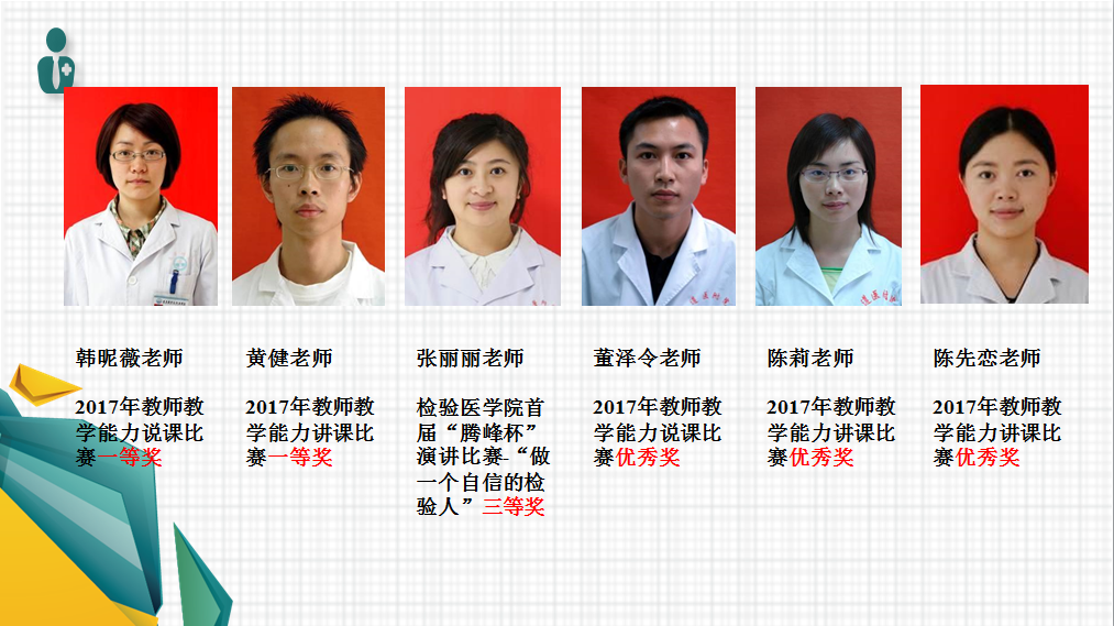 其他成果方面,“专业综合改革试点”项目(在研)、TNS模式建立及其在医学检验实习生能力培养中的应用探索(在研)”分获遵义医公司医学2017本科教学工作表彰;获得2017年度遵义医公司、遵义医公司医学与科技公司“老员工创新创业训练计划”资助项目2项、另外,教研室闵迅博士、陈泽慧教授、张丽丽博士先后受邀外出讲学10余次。