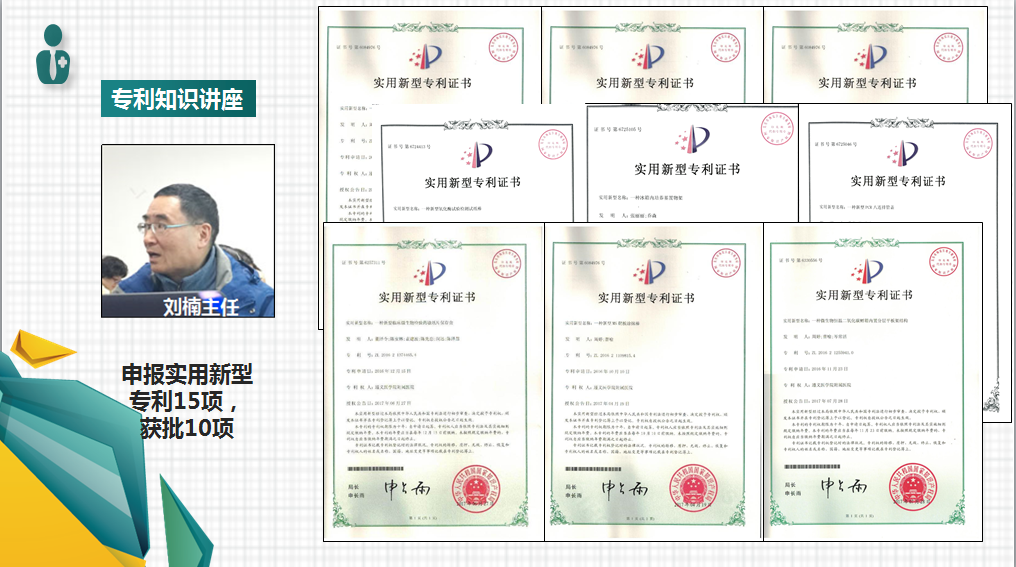 教研室不仅重视教学成果,还注重专利、科研等方面的成果。在邀请了贵阳专利事务所的责任人刘楠举办了专利知识讲座后,各位老师对申请专利的兴趣可谓空前高涨,今年我教研室申报实用新型专利15项,截止今日共获批10项。在科研课题方面,教研室石彬老师及黄健博士分获国家自然科学基金资助1项;其他课题获批2项,在研4项,结题2项。