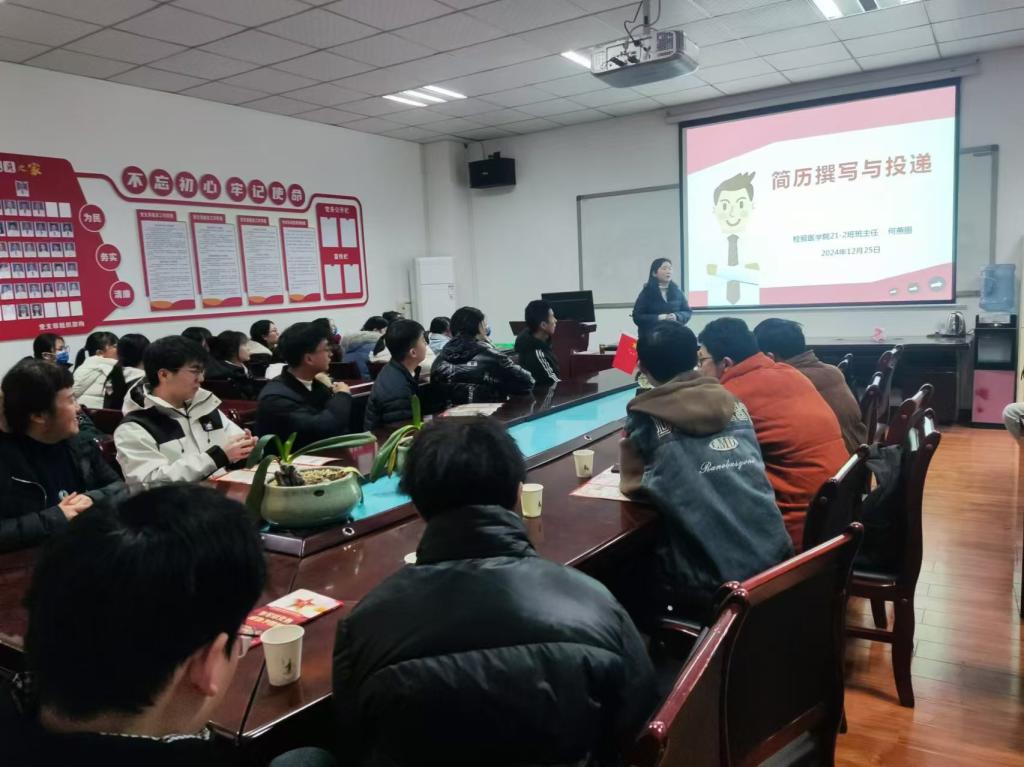 2025年1月3日,在第二附属医院检验科会议室,科主任葛晓军简要汇报了二附院检验科一年来的临床教学工作,到访老师与实习同学围绕学习、生活与就业意向等开展了深入细致的座谈交流,二附院教学副经理杨垒列席会议。何燕丽老师作《简历撰写与投递》就业指导培训。
