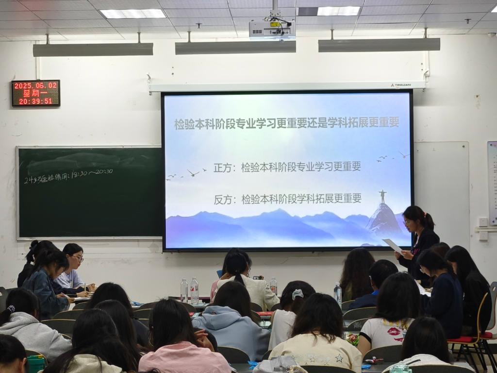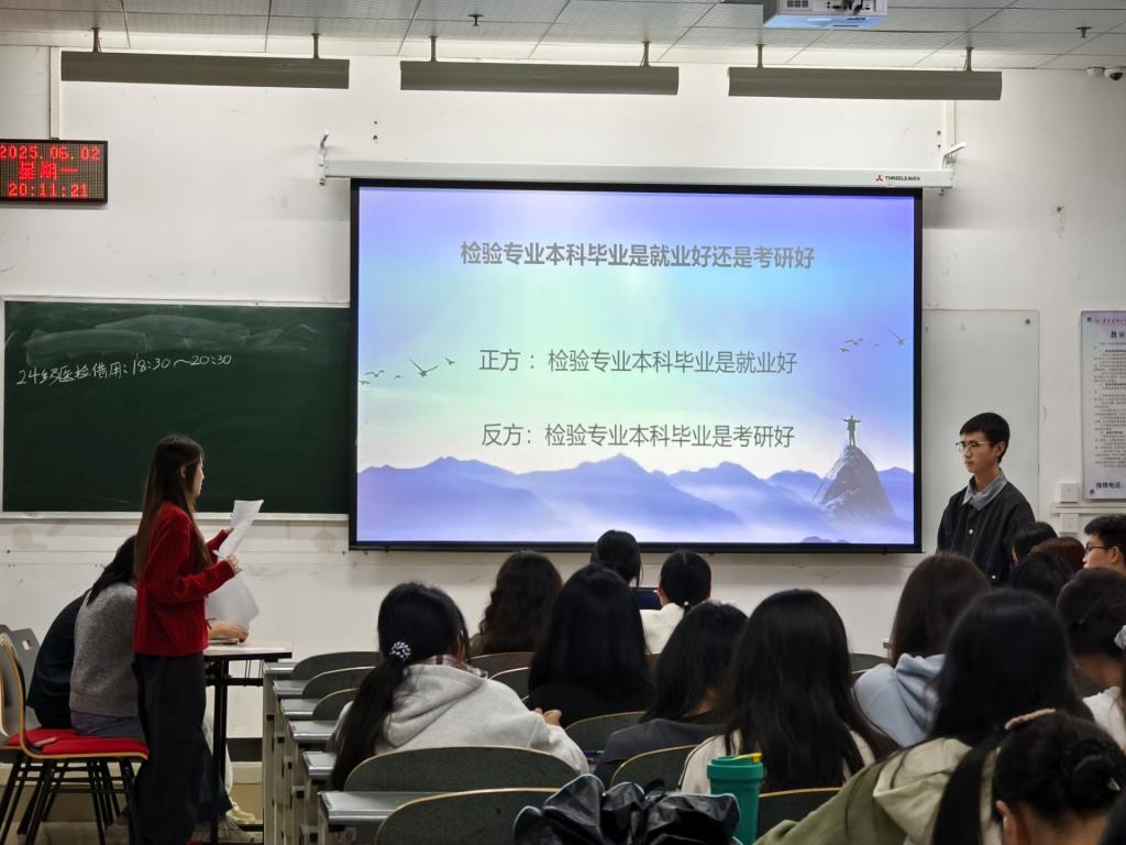 比赛聚焦医学检验技术专业设三个辩题,分别是“AI对检验专业是利大于弊还是弊大于利”“检验专业本科毕业是就业好还是考研好”“检验本科阶段是专业学习更重要还是学科拓展更重要”。同学们分别从技术创新与职业伦理、职业发展与学术研究的辩证统一、专业核心素养与跨学科能力的培养路径等方面开展了激烈辩论,同学们逻辑缜密、论证严谨,展现了扎实的专业知识储备与临场思辨能力,段晓雷、文旭、孙倩三位教师则分别从论点构建、辩论技巧等方面对比赛进行了点评,在充分肯定选手表现的同时,提出了改进建议。