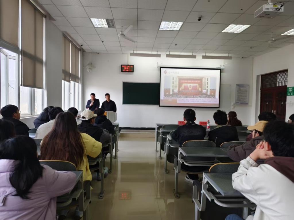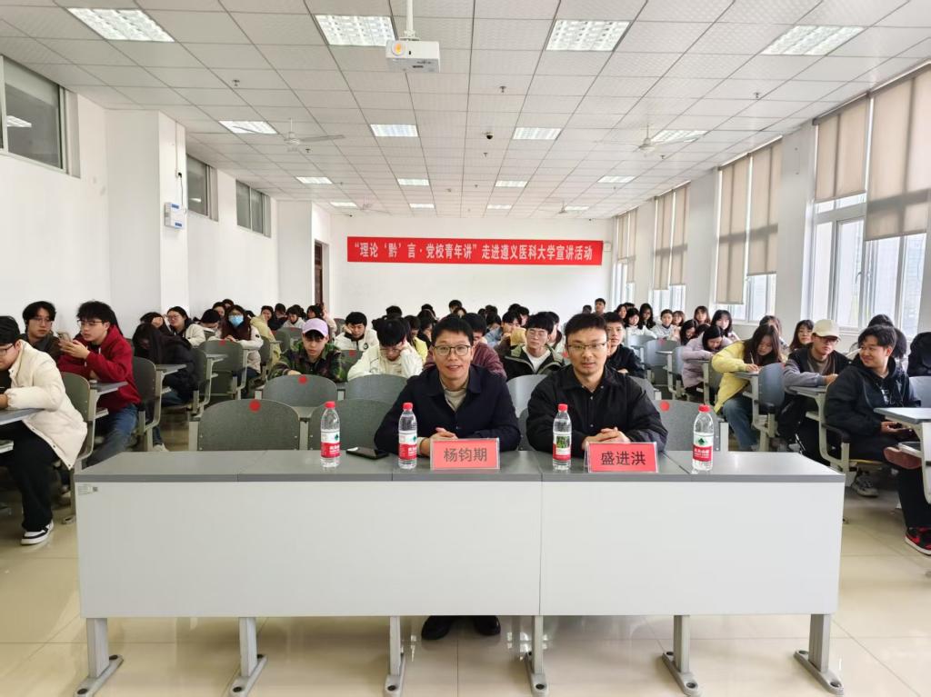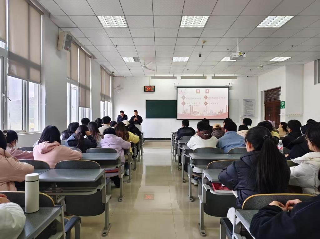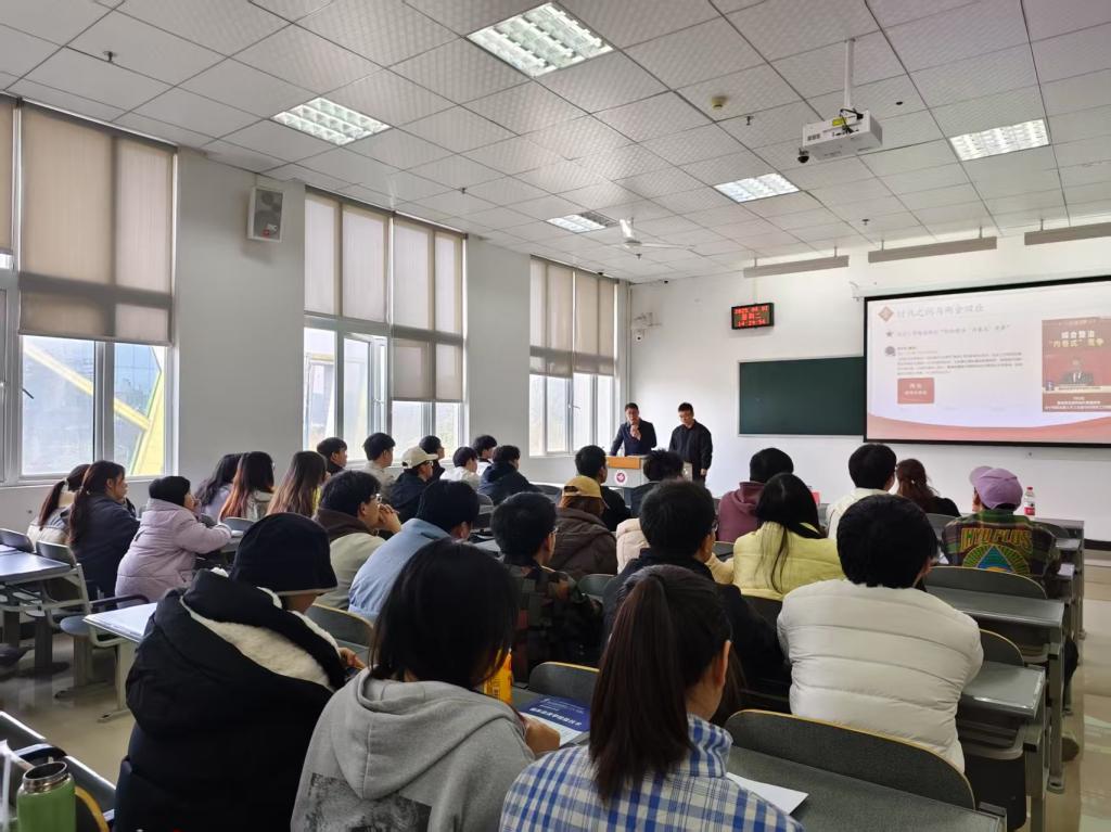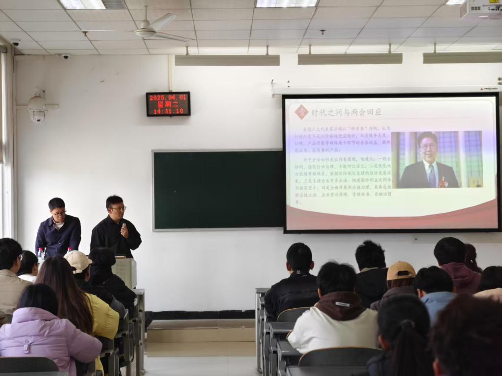 为深入学习贯彻习近平新时代中国特色社会主义思想,扎实推进党的创新理论"三进"工作,2025年4月1日,中共贵州省委党校讲师团成员、贵州师范大学马克思主义公司教授杨钧期、盛进洪同志赴williamhill中文官网,联合开展“理论‘黔言’·党校青年讲”(理论宣传二人讲)专题宣讲活动。活动以“打破内卷困局,重塑竞争新生态”为题宣讲2025年全国两会精神。公司党委书记周光润、副书记罗治宇、全体专职辅导员和22级员工共150余人参加活动。