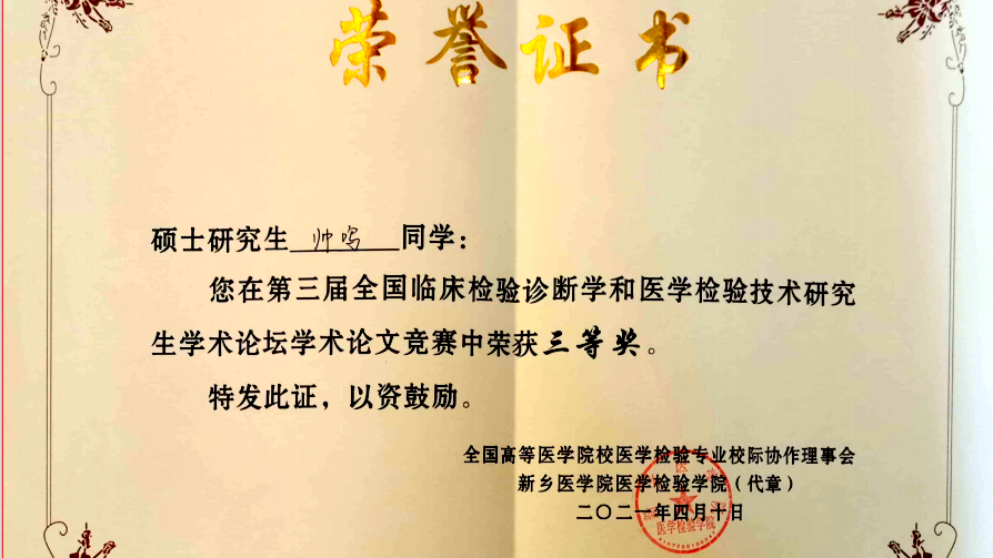 2021年4月8日至4月10日,由全国高等院校医学检验专业校际协作理事会主办、新乡医公司医学检验公司承办的第三届全国临床检验诊断学和医学检验技术研究生学术论坛在新乡召开,由williamhill中文官网派出的临床检验诊断学专业2019级硕士生帅鸣获得硕士研究生组三等奖。