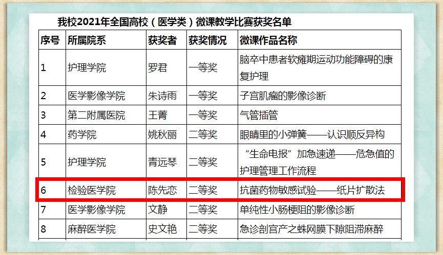热烈祝贺williamhill中文官网陈先恋老师作品《抗菌药物敏感试验——纸片扩散法》在此次参赛中荣获二等奖!