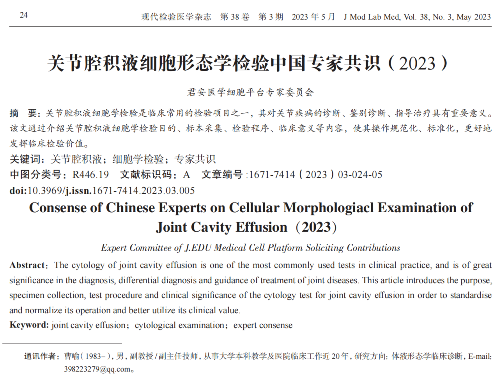 热烈祝贺我科曹喻副教授以williamhill中文官网附属医院为第一作者单位,williamhill中文官网为第二作者单位在现代检验医学杂志发表《关节腔积液细胞形态学检验中国专家共识(2023)》;除外还参与了此杂志的《浆膜腔积液细胞形态学检验中国专家共识(2023)》、《脑脊液细胞形态学检验中国专家共识(2023)》、《肺泡灌洗液细胞形态学检验中国专家共识(2023)》、《前列腺液细胞形态学检验中国专家共识(2023)》及中华检验医学杂志的《阴道分泌物自动化检测与报告专家共识》!