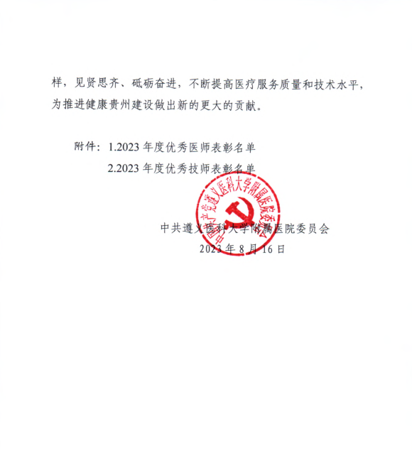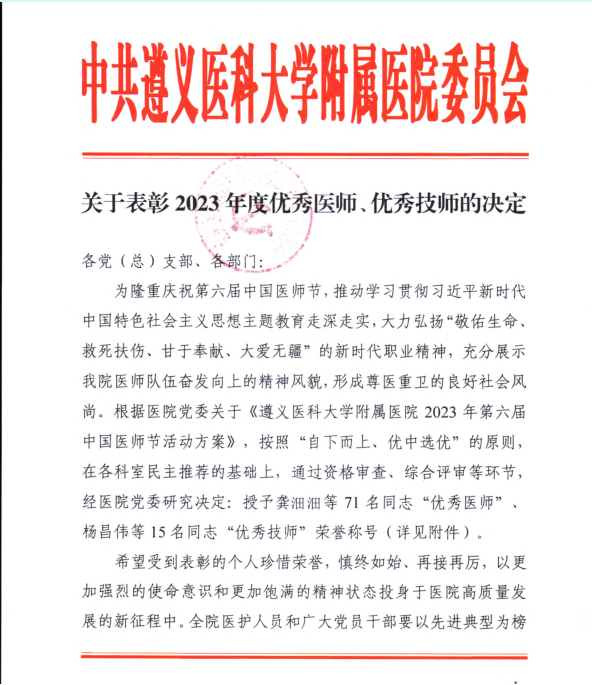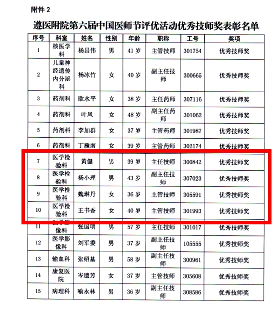 热烈祝贺williamhill中文官网附属医院医学检验科黄健教授、杨小理副教授、王书香、魏琳丹老师荣获2023年度优秀技师荣誉!