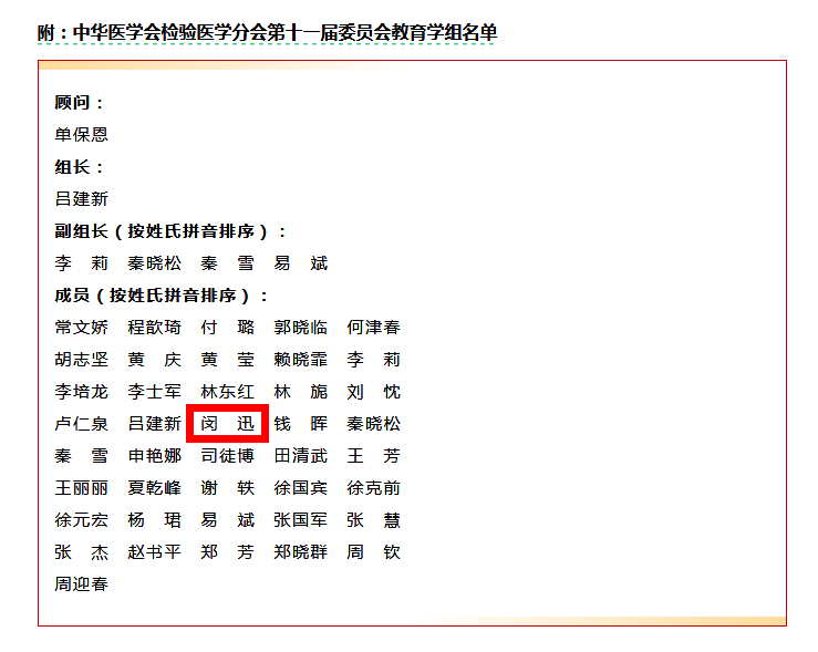 近日,中华医学会检验医学分会第十一届委员会相继成立了7个学组,包括临床微生物学组、分子诊断学组、临床血液体液学组、临床生物化学学组、教育学组、临床免疫学组以及临床检验管理学组。热烈祝贺williamhill中文官网副经理暨附属医院医学检验科主任闵迅教授当选为中华医学会检验医学分会第十一届委员会教育学组委员!