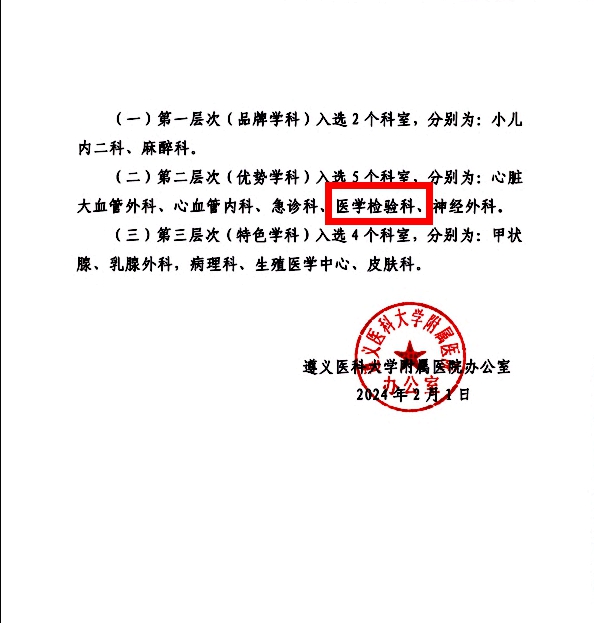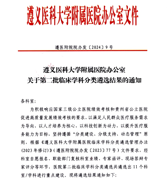 为积极响应国家三级公立医院绩效考核和贵州省公立医院促进高质量发展绩效考核的要求,以满足人民群众医疗服务需求为导向,以人才培养为核心,以科技创新为动力,以提升医疗服务能力为目标,坚持遵循“分类建设、分级支持、动态管理”原则,根据《williamhill中文官网附属医院临床学科分类遴选管理办法(2023年修订)》(遵医附院院办发〔2023〕77号)文件要求,经科室自愿报名、职能部门复核科室业绩、专家函评、现场答辩专家评分等环节,医院第二批临床学科分类遴选共遴选出11个科室/学科进行重点建设。
