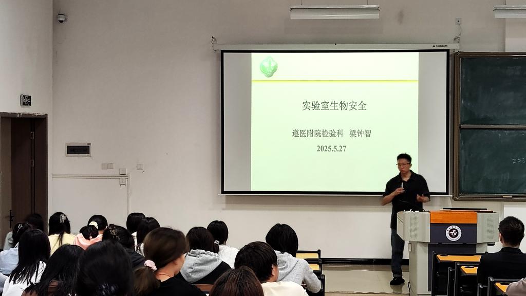 随后由梁钟智老师聚焦实验室安全开展了深度培训。他深入剖析了医学检验学实验室常见化学物品、病原微生物的危害,并系统阐述了实验室安全的核心规范:从实验室准入、个人防护装备的规范穿戴与脱卸,到标准实验操作流程、实验废物安全处置等关键环节。他着重强调要保持实验室安全意识的重要性,详细讲解了发生职业暴露后的应急处理流程,要求同学们时刻绷紧安全之弦,将风险防范前置化。